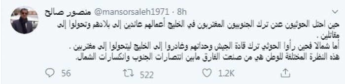 وقال في تغريدة عبر "تويتر" رصدها "المشهد العربي":"حين احتل الحوثيون عدن ترك الجنوبيون المغتربون في الخليج أعمالهم عائدين إلى بلادهم وتحولوا إلى مقاتلين.أما شمالاً فحين رأوا الحوثي ترك قادة الجيش وحداتهم وغادروا إلى الخليج ليتحولوا إلى مغتربين. هذه النظرة المختلفة للوطن هي من صنعت الفارق مابين انتصارات الجنوب وانكسارات الشمال".