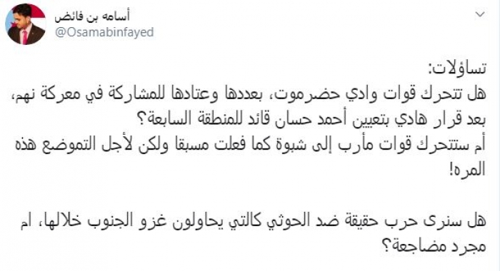 وقال في تغريدة عبر "تويتر" رصدها "المشهد العربي": "تساؤلات.. هل تتحرك قوات وادي حضرموت، بعددها وعتادها للمشاركة في معركة نهم، بعد قرار هادي بتعيين أحمد حسان قائد للمنطقة السابعة؟ أم ستتحرك قوات مأرب إلى شبوة كما فعلت مسبقاً ولكن لأجل التموضع هذه المرة هل سنرى حرب حقيقة ضد الحوثي كالتي يحاولون غزو الجنوب خلالها، أم مجرد مضاجعة؟".