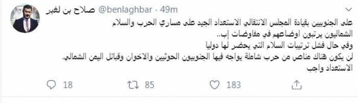 طالب الإعلامي صلاح بن لغبر، اليوم، الجنوبيين بالاستعداد الجيد على مساري الحرب والسلام.