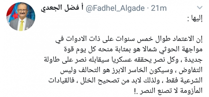 وكتب الجعدي، في تغريدة له على موقع التواصل الاجتماعي تويتر، تابعها المشهد العربي: "إن الاعتماد طوال خمس سنوات على ذات الادوات في مواجهة الحوثي شمالا هو بمثابة منحه كل يوم قوة جديدة".