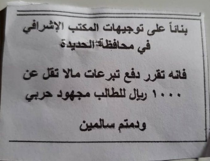 وحسب منشور متداول، فقد ألزمت مليشيا الحوثي طلاب المدارس الخاصة بالمحافظة بالتبرع بمبلغ مالي قدره ألف ريال لصالح المجهود الحربي لها.