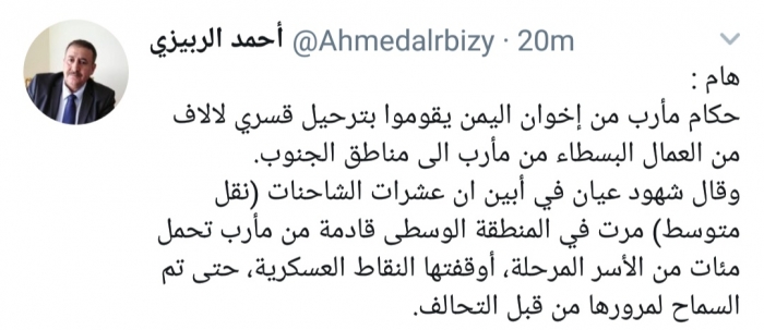 وكتب الربيزي، في تغريدة له عبر موقع التواصل الاجتماعي تويتر، تابعها المشهد العربي: "حكام مأرب من إخوان اليمن يقوموا بترحيل قسري لآلاف من العمال البسطاء من مأرب إلى مناطق الجنوب".