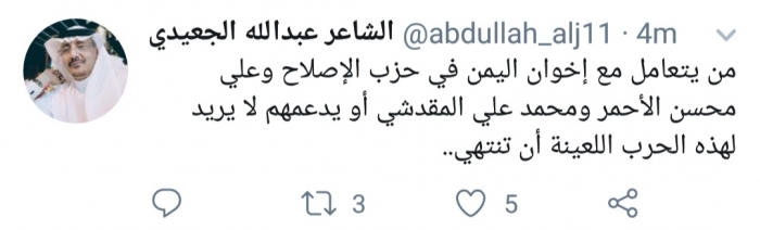 وكتب الجعيدي، في تغريدة له على موقع التواصل الاجتماعي تويتر، تابعها المشهد العربي: "من يتعامل مع إخوان اليمن في حزب الإصلاح وعلي محسن الأحمر ومحمد علي المقدشي أو يدعمهم لا يريد لهذه الحرب اللعينة أن تنتهي".