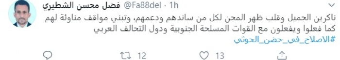 وقال في تغريدة عبر "تويتر" رصدها "المشهد العربي": "ناكرين الجميل وقلب ظهر المجن لكل من ساندهم ودعمهم، وتبني مواقف مناوئة لهم كما فعلوا ويفعلون مع القوات المسلحة الجنوبية ودول التحالف العربي".