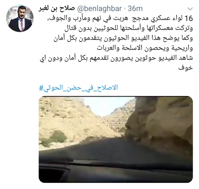 وكتب بن لغبر، في تغريدة له على موقع التواصل الاجتماعي تويتر، تابعها المشهد العربي: "16 لواء عسكري مدجج هربت في نهم ومأرب والجوف، وتركت معسكراتها وأسلحتها للحوثيين بدون قتال وكما يوضح هذا الفيديو الحوثيون يتقدمون بكل أمان وأريحية ويحصون الأسلحة والعربات".