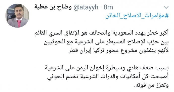 تفاعل عضو الجمعية الوطنية الجنوبية وضاح بن عطية، مع هاشتاج "مؤامرات الإصلاح الخائن".