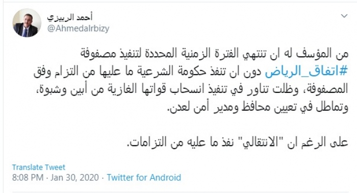 وقال في تغريدة على حسابه بموقع التواصل الاجتماعي، تويتر، اليوم الخميس، إنه: "من المؤسف له أن تنتهي الفترة الزمنية المحددة لتنفيذ مصفوفة اتفاق الرياض دون أن تنفذ حكومة الشرعية ما عليها من التزام وفق المصفوفة".