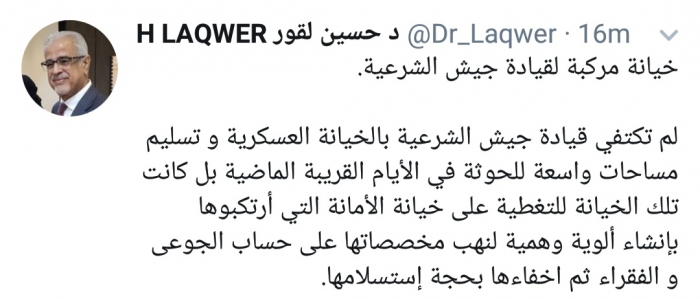 وكتب لقور، في تغريدة له عبر موقع التواصل الاجتماعي تويتر، تابعها المشهد العربي: " تكتفي قيادة جيش الشرعية بالخيانة العسكرية وتسليم مساحات واسعة للحوثة في الأيام القريبة الماضية بل كانت تلك الخيانة للتغطية على خيانة الأمانة التي ارتكبوها بإنشاء ألوية وهمية لنهب مخصصاتها على حساب الجوعى و الفقراء ثم اخفاءها بحجة استسلامها".