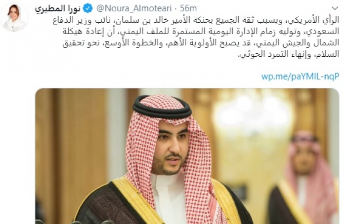 وكتبت في تغريدة عبر "تويتر" رصدها "المشهد العربي": "الرأي الأمريكي، وبسبب ثقة الجميع بحنكة الأمير خالد بن سلمان، نائب وزير الدفاع السعودي، وتوليه زمام الإدارة اليومية المستمرة للملف اليمني، أن إعادة هيكلة الشمال والجيش اليمني، قد يصبح الأولوية الأهم، والخطوة الأوسع، نحو تحقيق السلام، وإنهاء التمرد الحوثي".