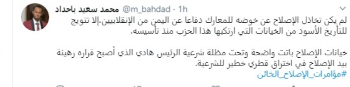 باحداد: خيانات الإصلاح باتت واضحة.. وتحت مظلة هادي