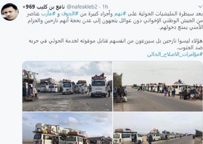 وقال في تغريدة عبر "تويتر" رصدها "المشهد العربي": "بعد سيطرة المليشيات الحوثية على نهم وأجزاء كبيرة من الجوف ومأرب عناصر من الجيش الوطني الإخواني دون عوائل يتجهون إلى عدن بحجة أنهم نازحين والحزام الأمني يمنع دخولهم. هؤلاء ليسوا نازحين بل سيزرعون من أنفسهم قنابل موقوته لخدمة الحوثي في حربه ضد الجنوب".