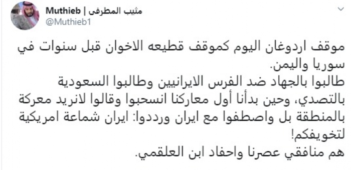 وقال في تغريدة عبر "تويتر" رصدها "المشهد العربي": "موقف أردوغان اليوم كموقف قطيعه الإخوان قبل سنوات في سوريا واليمن. طالبوا بالجهاد ضد الفرس الإيرانيين وطالبوا السعودية بالتصدي، وحين بدأنا أول معاركنا انسحبوا وقالوا لا نريد معركة بالمنطقة بل واصطفوا مع إيران ورددوا: إيران شماعة أمريكية لتخويفكم! هم منافقي عصرنا وأحفاد ابن .....".