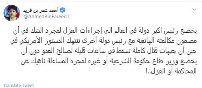 وقال في تغريدة عبر "تويتر" رصدها "المشهد العربي": "يخضع رئيس أكبر دولة في العالم إلى إجراءات العزل لمجرد الشك في أن مضمون مكالمته الهاتفية مع رئيس دولة أخرى تنتهك الدستور الأمريكي في حين أن جبهات قتال كاملة تسقط في ساعات قليلة لصالح العدو دون أن يخضع وزير دفاع حكومة الشرعية أو غيره لمجرد المساءلة ناهيك عن المحاكمة أو العزل".