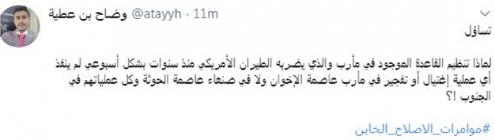 وقال في تغريدة عبر "تويتر" رصدها "المشهد العربي": "تساؤل لماذا تنظيم القاعدة الموجود في مأرب والذي يضربه الطيران الأمريكي منذ سنوات بشكل أسبوعي لم ينفذ أي عملية إغتيال أو تفجير في مأرب عاصمة الإخوان ولا في صنعاء عاصمة الحوثة وكل عملياتهم في الجنوب !؟ مؤامرات الإصلاح الخاين".