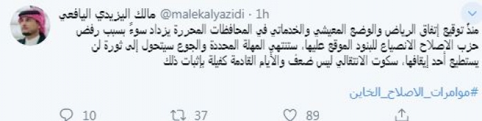 وقال في تغريدة عبر "تويتر" رصدها "المشهد العربي": "منذُ توقيع اتفاق الرياض والوضع المعيشي والخدماتي في المحافظات المحررة يزداد سوءً بسبب رفض حزب الاصلاح الانصياع للبنود الموقع عليها، ستنتهي المهلة المحددة والجوع سيتحول إلى ثورة لن يستطيع أحد إيقافها، سكوت الانتقالي ليس ضعف والأيام القادمة كفيلة بإثبات ذلك".