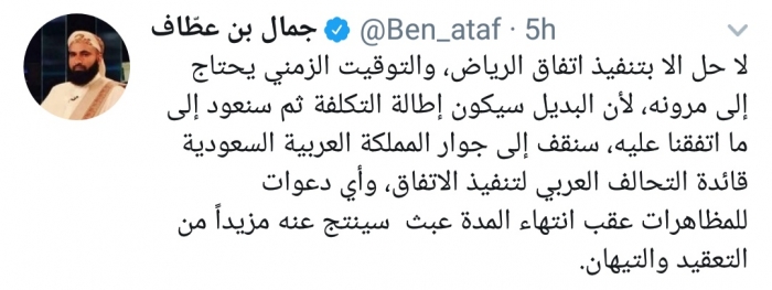 وكتب بن عطاف، في تغريدة له على موقع التواصل الاجتماعي تويتر، تابعها المشهد العربي: "لا حل إلا بتنفيذ اتفاق الرياض، والتوقيت الزمني يحتاج إلى مرونة، لأن البديل سيكون إطالة التكلفة ثم سنعود إلى ما اتفقنا عليه".