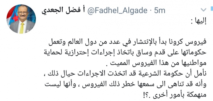 سخر عضو هيئة رئاسة المجلس الانتقالي الجنوبي فضل الجعدي، مما تسمى بحكومة الشرعية، وطالبها باتخاذ الإجراءات الإحترازية لحماية مواطنيها من فيروس كورونا.