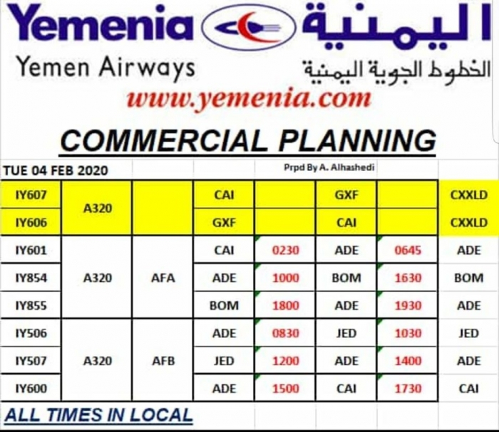 ينشر "المشهد العربي" مواعيد رحلات طيران اليمنية غداً الثلاثاء، الموافق 4 فبراير 2020.