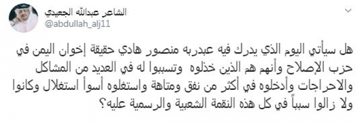 وجه الشاعر عبدالله الجعيدي، اليوم، تساؤلاً مُحرجًا للرئيس اليمني المؤقت عبدربه منصور هادي، بشأن إخوان اليمن.