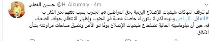 وكتب في تغريدة عبر "تويتر" رصدها "المشهد العربي": "لم تتوقف انتهاكات مليشيات الإصلاح اليومية بحق المواطنين في الجنوب بسبب دفعهم نحو الكفر باتفاق الرياض وبنوده لكي لا يكون له حاضنة شعبية في الجنوب وإظهار الانتقالي بموقف الضعيف في حين أن دبلوماسيته الحالية تضغط على مليشيات الإصلاح يومًا تلو الآخر وتضيق مساحات مراوغته بشأن الاتفاق".