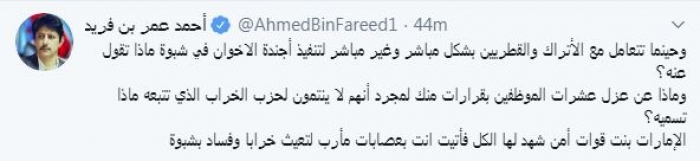 وقال في تغريدة عبر "تويتر" رصدها "المشهد العربي": "وحينما تتعامل مع الأتراك والقطريين بشكل مباشر وغير مباشر لتنفيذ أجندة الإخوان في شبوة ماذا تقول عنه؟ وماذا عن عزل عشرات الموظفين بقرارات منك لمجرد أنهم لا ينتمون لحزب الخراب الذي تتبعه ماذا تسميه؟".
