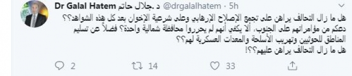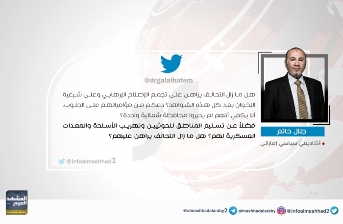 غرد الأكاديمي والسياسي الإماراتي الدكتور جلال حاتم، اليوم، عن أبرز جرائم حزب الإصلاح في اليمن والجنوب، متسائلاً: "هل ما زال التحالف يُراهن عليهم؟".