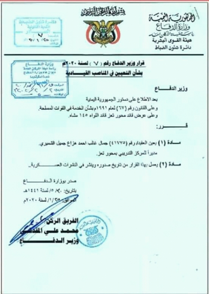 في استمرار سياسة تدوير أتباعها في المناصب القيادية، قرر وزير الدفاع اليمني، محمد المقدشي، تعيين جمال الشميري مديراً لمركز التدريب في محور تعز، الخاضع لسيطرة مليشيا الإخوان.