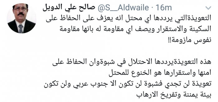 وكتب الدويل، في تغريدة له عبر موقع التواصل الاجتماعي تويتر، تابعها المشهد العربي: "التعويذة التي يرددها أي محتل أنه يعزف على الحفاظ على السكينة والاستقرار ويصف أي مقاومة له بأنها مقاومة نفوس مأزومة، هذه التعويذة يرددها الاحتلال في شبوة وأن الحفاظ على أمنها واستقرارها هو الخنوع للمحتل".