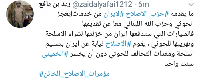 وتابع: "المليارات التي ستدفعها إيران من خزنتها لشراء الأسلحة وتهريبها للحوثي، يقوم الإصلاح نيابة عن إيران بتسليم أسلحة ومعدات التحالف للحوثي دون أن يخسر الخميني سنت واحد".