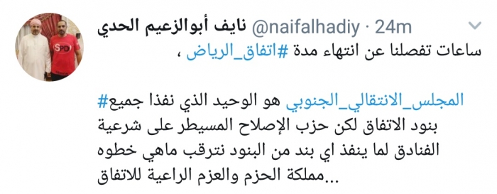 وكتب الحدي، في تغريدة له على موقع التواصل الاجتماعي تويتر، تابعها المشهد العربي: "ساعات تفصلنا عن انتهاء مدة اتفاق الرياض".