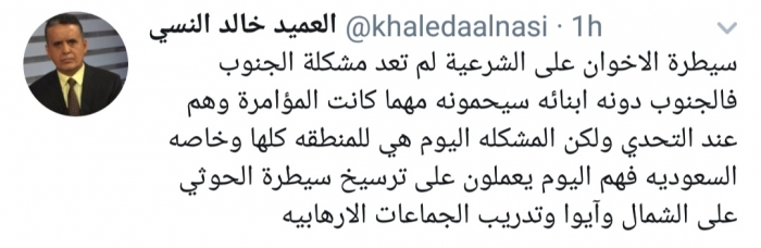 وكتب النسي، في تغريدة له على موقع التواصل الاجتماعي تويتر، تابعها المشهد العربي: "سيطرة الإخوان على الشرعية لم تعد مشكلة الجنوب فالجنوب دونه أبنائه سيحمونه مهما كانت المؤامرة وهم عند التحدي".