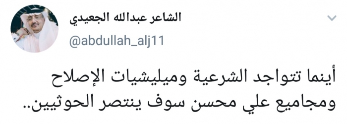 وكتب الجعيدي، في تغريدة له على موقع التواصل الاجتماعي تويتر، تابعها المشهد العربي: "أينما تتواجد الشرعية وميليشيات الإصلاح ومجاميع علي محسن سوف ينتصر الحوثيين".