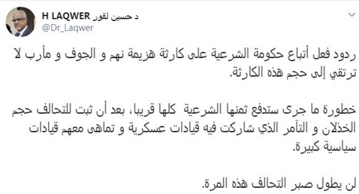 وكتب في تغريدة عبر "تويتر" رصدها "المشهد العربي": "ردود فعل أتباع حكومة الشرعية على كارثة هزيمة نهم والجوف ومأرب لا ترتقي إلى حجم هذه الكارثة".