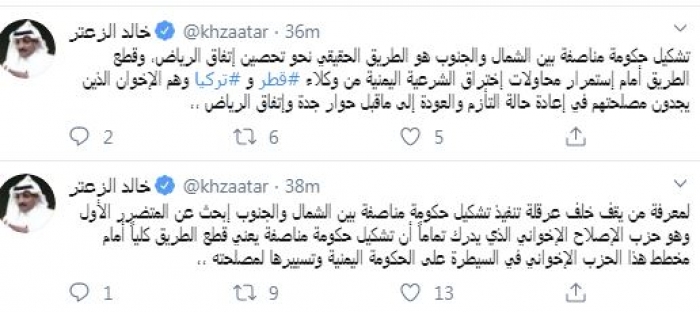 وأوضح: "تشكيل حكومة مناصفة بين الشمال والجنوب هو الطريق الحقيقي نحو تحصين اتفاق الرياض، وقطع الطريق أمام إستمرار محاولات اختراق الشرعية اليمنية من وكلاء قطر وتركيا وهم الإخوان الذين يجدون مصلحتهم في إعادة حالة التأزم والعودة إلى ماقبل حوار جدة واتفاق الرياض".