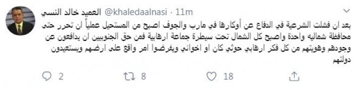 وقال في تغريدة عبر "تويتر" رصدها "المشهد العربي": "بعد أن فشلت الشرعية في الدفاع عن أوكارها في مأرب والجوف أصبح من المستحيل عملياً أن تحرر حتى محافظة شمالية واحدة وأصبح كل الشمال تحت سيطرة جماعة إرهابية فمن حق الجنوبيين أن يدافعون عن وجودهم وهويتهم من كل فكر إرهابي حوثي كان أو إخواني ويفرضوا أمر واقع على أرضهم ويستعيدون دولتهم".