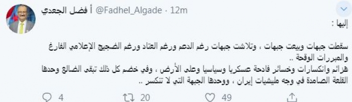وكتب في تغريدة عبر "تويتر" رصدها "المشهد العربي": "سقطت جبهات وبيعت جبهات، وتلاشت جبهات رغم الدعم ورغم العتاد ورغم الضجيج الإعلامي الفارغ والمبررات الوقحة.. هزائم وانكسارات وخسائر فادحة عسكريًا وسياسيًا وعلى الأرض، وفي خضم كل ذلك تبقى الضالع وحدها القلعة الصامدة في وجه مليشيات إيران، ووحدها الجبهة التي لا تنكسر".