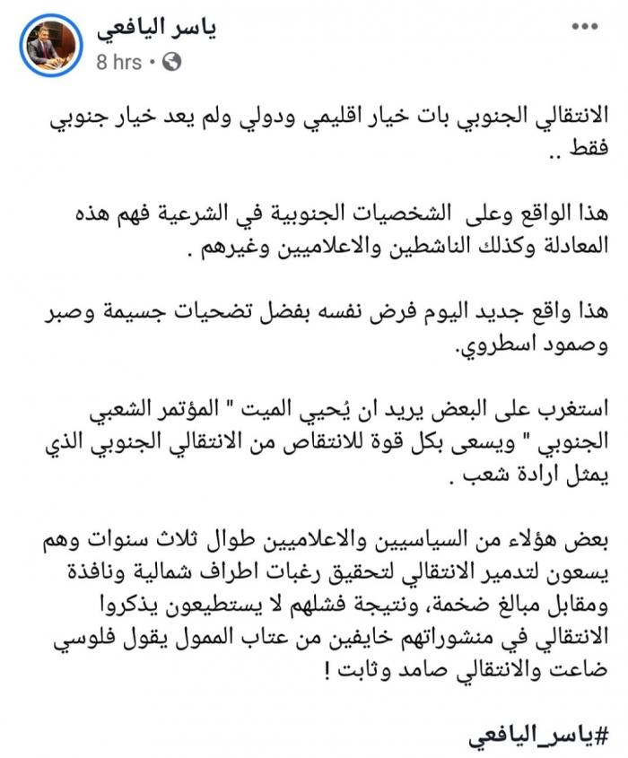 وكتب اليافعي، في تدوينة له على موقع التواصل الاجتماعي فيسبوك، تابعها المشهد العربي: "المجلس الانتقالي بات خيارا إقليميا ودوليا ولم يعد خيار جنوبي فقط، هذا الواقع وعلى الشخصيات الجنوبية في الشرعية فهم هذه المعادلة وكذلك الناشطين والإعلاميين وغيرهم".