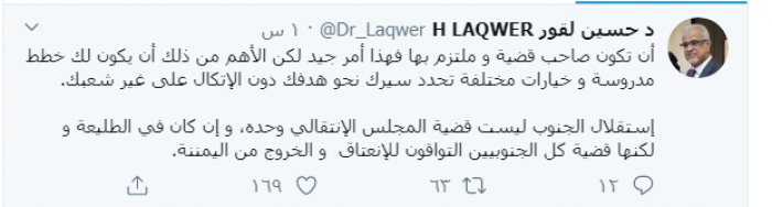 وكتب لقور عبر "تويتر ":"أن تكون صاحب قضية و ملتزم بها فهذا أمر جيد لكن الأهم من ذلك أن يكون لك خطط مدروسة و خيارات مختلفة تحدد سيرك نحو هدفك دون الإتكال على غير شعبك".