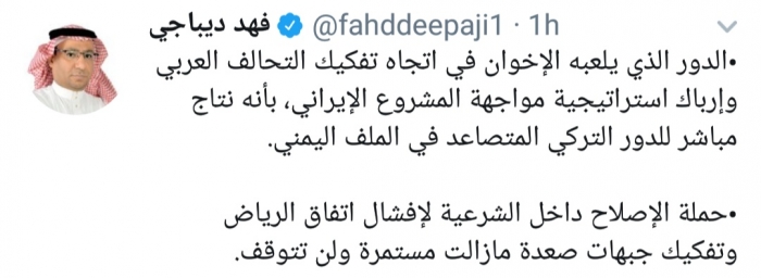 وكتب ديباجي، في تغريدة له عبر موقع التواصل الاجتماعي تويتر، تابعها المشهد العربي: "الدور الذي يلعبه الإخوان في اتجاه تفكيك التحالف العربي وإرباك استراتيجية مواجهة المشروع الإيراني، إنه نتاج مباشر للدور التركي المتصاعد في الملف اليمني".