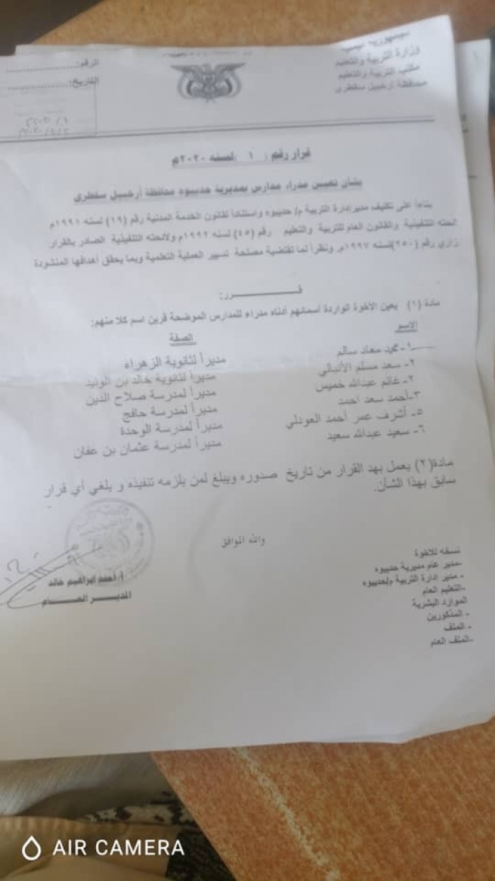 لنشر الفكر الإخواني المتطرف..تعيين مدراء جدد بعدد من مدارس سقطرى (وثيقة)