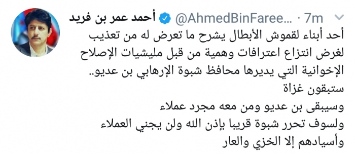ونشر بن فريد، عبر حسابه على موقع التواصل الاجتماعي تويتر، تابعه المشهد العربي، "مقطعا مصورا لأحد أبناء لقموش الأبطال يشرح ما تعرض له من تعذيب لغرض انتزاع اعترافات وهمية من قبل مليشيات الإصلاح الإخوانية التي يديرها محافظ شبوة الإرهابي بن عديو".