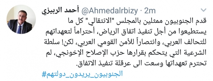 وكتب الربيزي، في تغريدة له على موقع التواصل الاجتماعي تويتر، تابعها المشهد العربي: "قدم الجنوبيون ممثلين بالمجلس الانتقالي كل ما يستطيعوا من أجل تنفيذ اتفاق الرياض، احتراماً لتعهداتهم للتحالف العربي، وانتصاراً للأمن القومي العربي".
