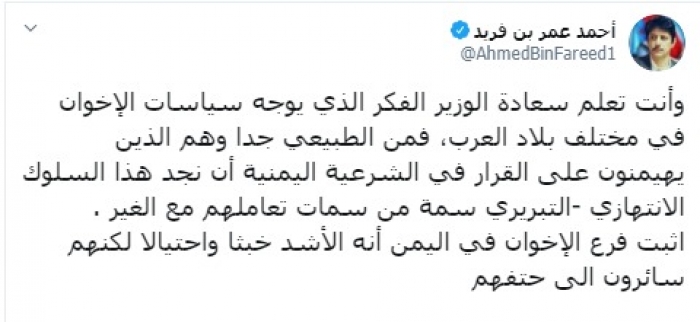 وكتب "بن فريد" في تغريدة عبر حسابه بتويتر، رصدها "المشهد العربي": "وأنت تعلم سعادة الوزير الفكر الذي يوجه سياسات الإخوان في مختلف بلاد العرب، فمن الطبيعي جدا وهم الذين يهيمنون على القرار في الشرعية اليمنية أن نجد هذا السلوك الانتهازي -التبريري سمة من سمات تعاملهم مع الغير" .