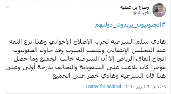 وكتب "بن عطية" في تغريدة عبر حسابه بتويتر، رصدها "المشهد العربي": "هادي سلم الشرعية لحزب الإصلاح الإخواني وهذا نزع الثقة عند المجلس الإنتقالي وشعب الجنوب".