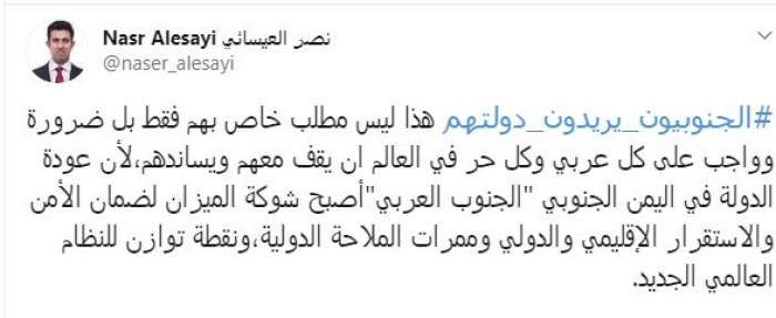وقال في تغريدة عبر "تويتر" رصدها "المشهد العربي": "الجنوبيون يريدون دولتهم هذا ليس مطلب خاص بهم فقط بل ضرورة وواجب على كل عربي وكل حر في العالم أن يقف معهم ويساندهم، لأن عودة الدولة في اليمن الجنوبي (الجنوب العربي) أصبح شوكة الميزان لضمان الأمن والاستقرار الإقليمي والدولي وممرات الملاحة الدولية، ونقطة توازن للنظام العالمي الجديد".