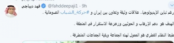 وقال في تغريدة عبر "تويتر" رصدها "المشهد العربي": "رغم تباين الإيديولوجيا.. علاقات وثيقة وتعاون بين إيران وحركة الشباب الصومالية.. الهدف هو دعم الإرهاب والحوثيين وزعزعة الاستقرار في المنطقة".