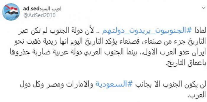 وكتب في تغريدة عبر "تويتر" رصدها "المشهد العربي": "لماذا الجنوبيون يريدون دولتهم .. لأن دولة الجنوب لم تكن عبر التاريخ جزء من صنعاء، فصنعاء يؤكد التاريخ اليوم أنها زيدية ذهبت نحو إيران عدو العرب الأول.. بينما الجنوب العربي دولة عربية ضاربة جذروها بأعماق التاريخ. لن يكون الجنوب إلا بجانب السعودية والامارات ومصر وكل دول العرب".