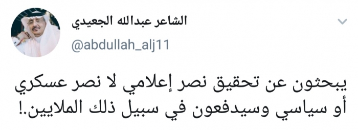 وكتب الجعيدي، في تغريدة له على موقع التواصل الاجتماعي تويتر، تابعها المشهد العربي: "يبحثون عن تحقيق نصر إعلامي لا نصر عسكري أو سياسي وسيدفعون في سبيل ذلك الملايين".