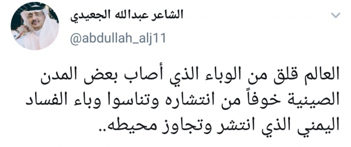 وكتب الجعيدي، في تغريدة له على موقع التواصل الاجتماعي تويتر، تابعها المشهد العربي: "العالم قلق من الوباء الذي أصاب بعض المدن الصينية خوفاً من انتشاره وتناسوا وباء الفساد اليمني الذي انتشر وتجاوز محيطه".