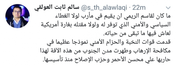 وكتب العولقي، في تغريدة له على موقع التواصل الاجتماعي تويتر، تابعها المشهد العربي: "ما كان لقاسم الريمي أن يقيم في مأرب لولا الغطاء السياسي والأمني الذي توفر له ولولا مقتله بغارة أمريكية لعاش فيها ما تبقى من حياته".